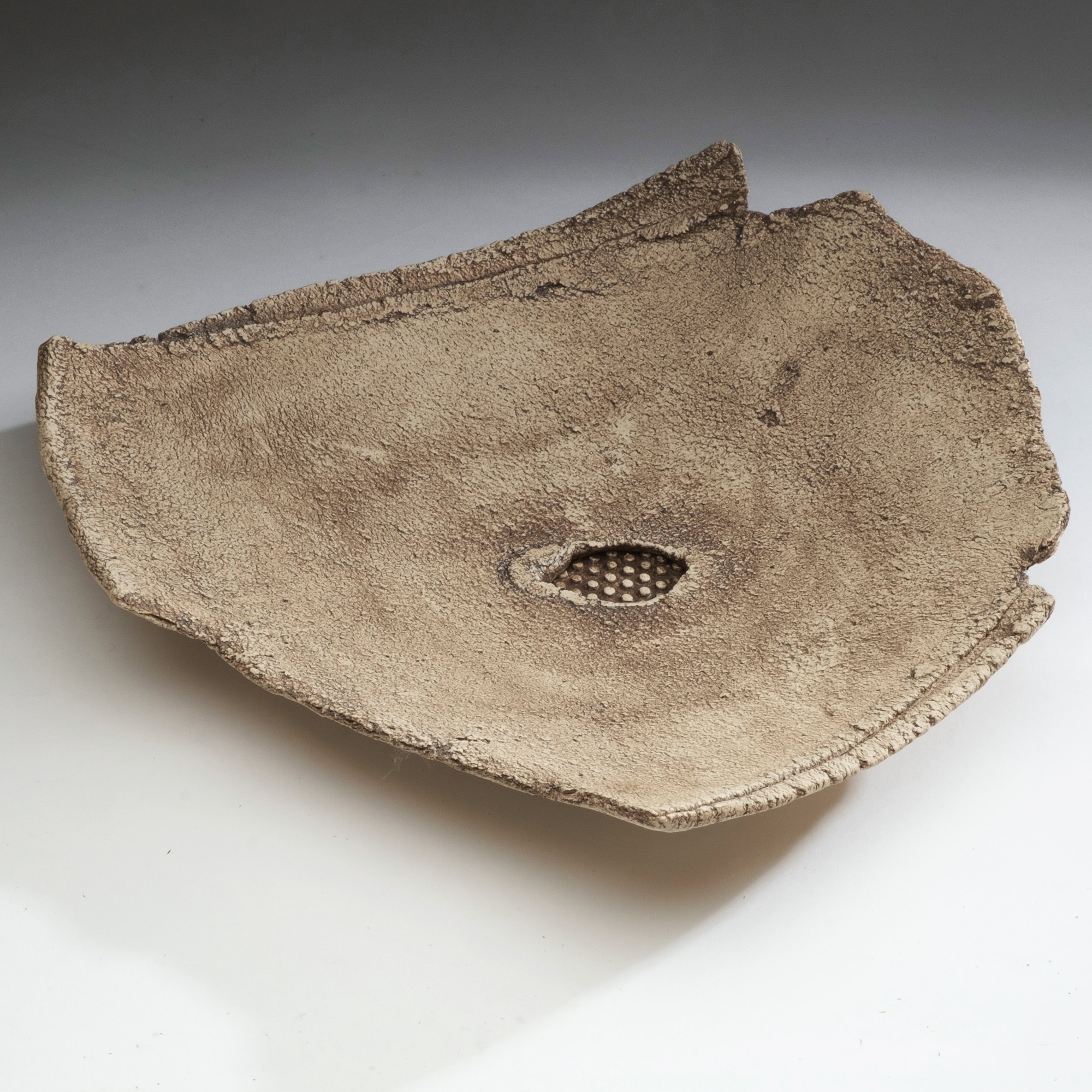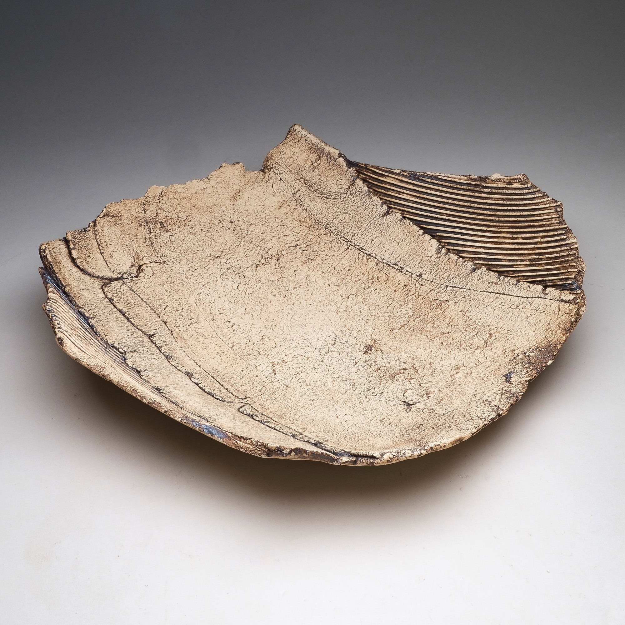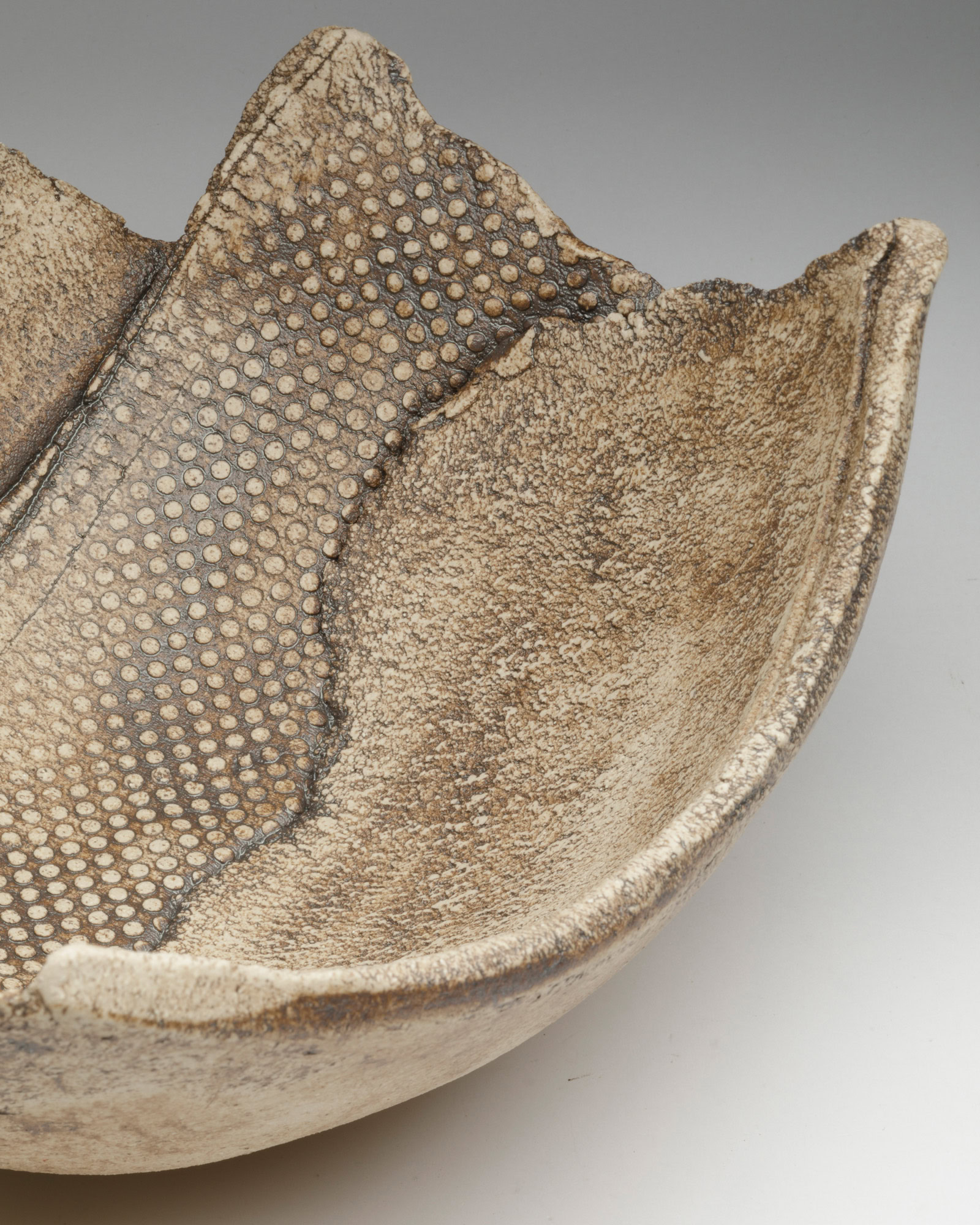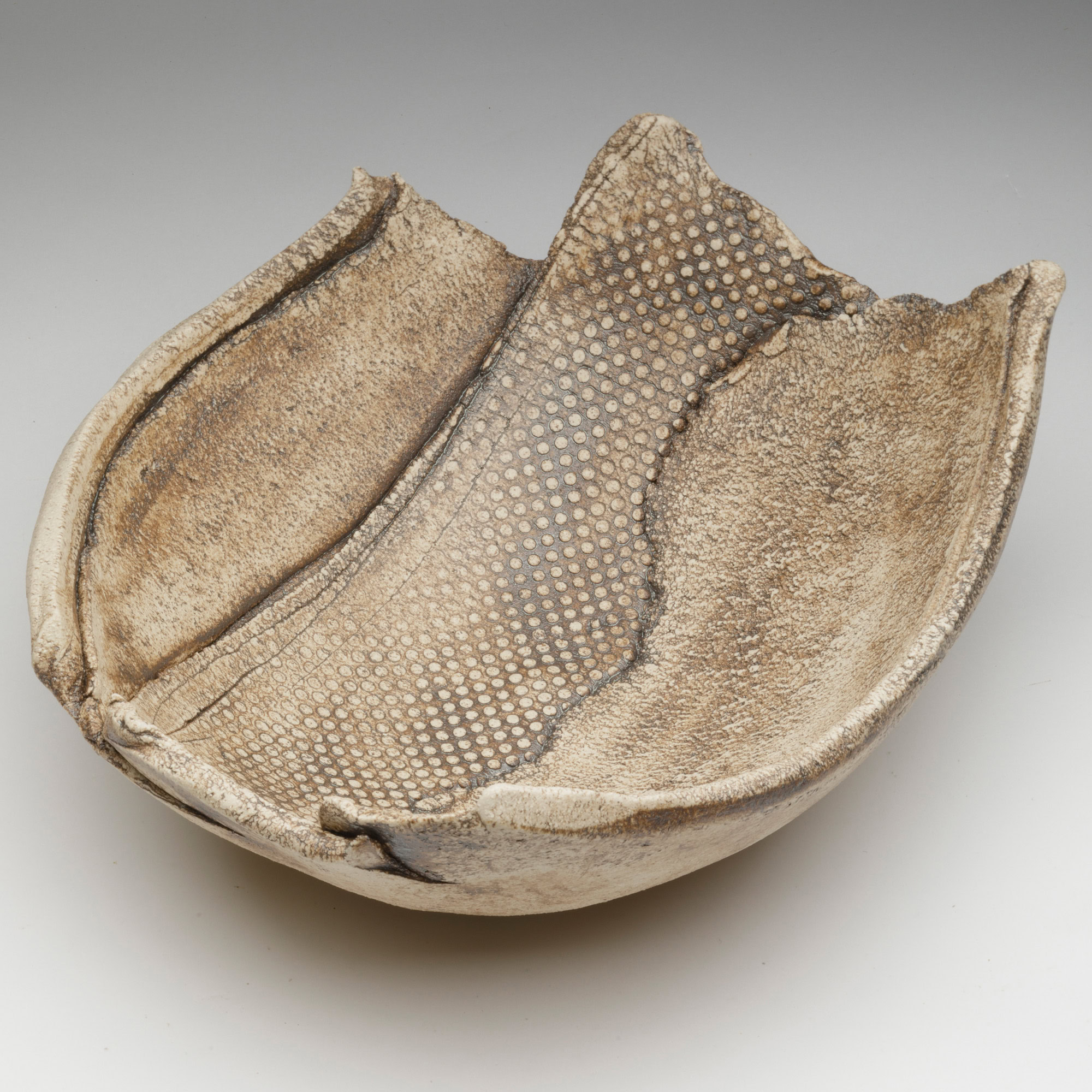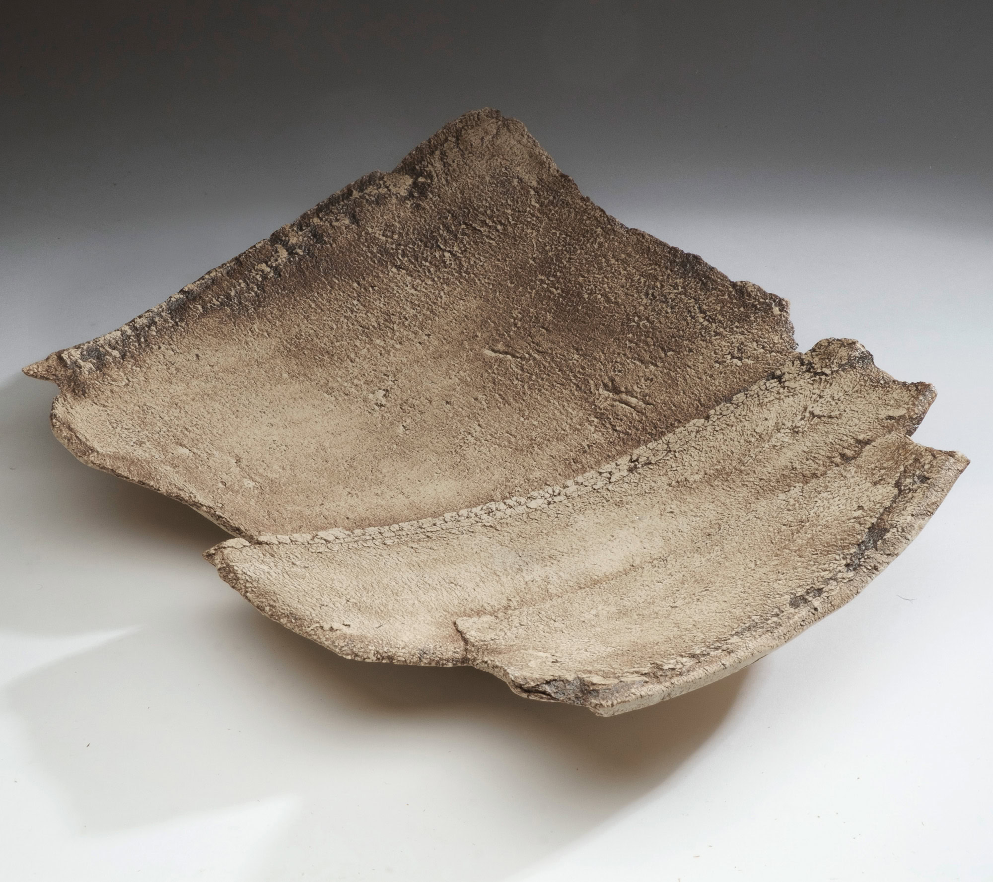 Multiple torn strips of clay joined by dot-patterned slabs.