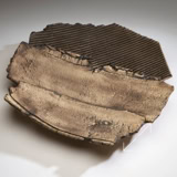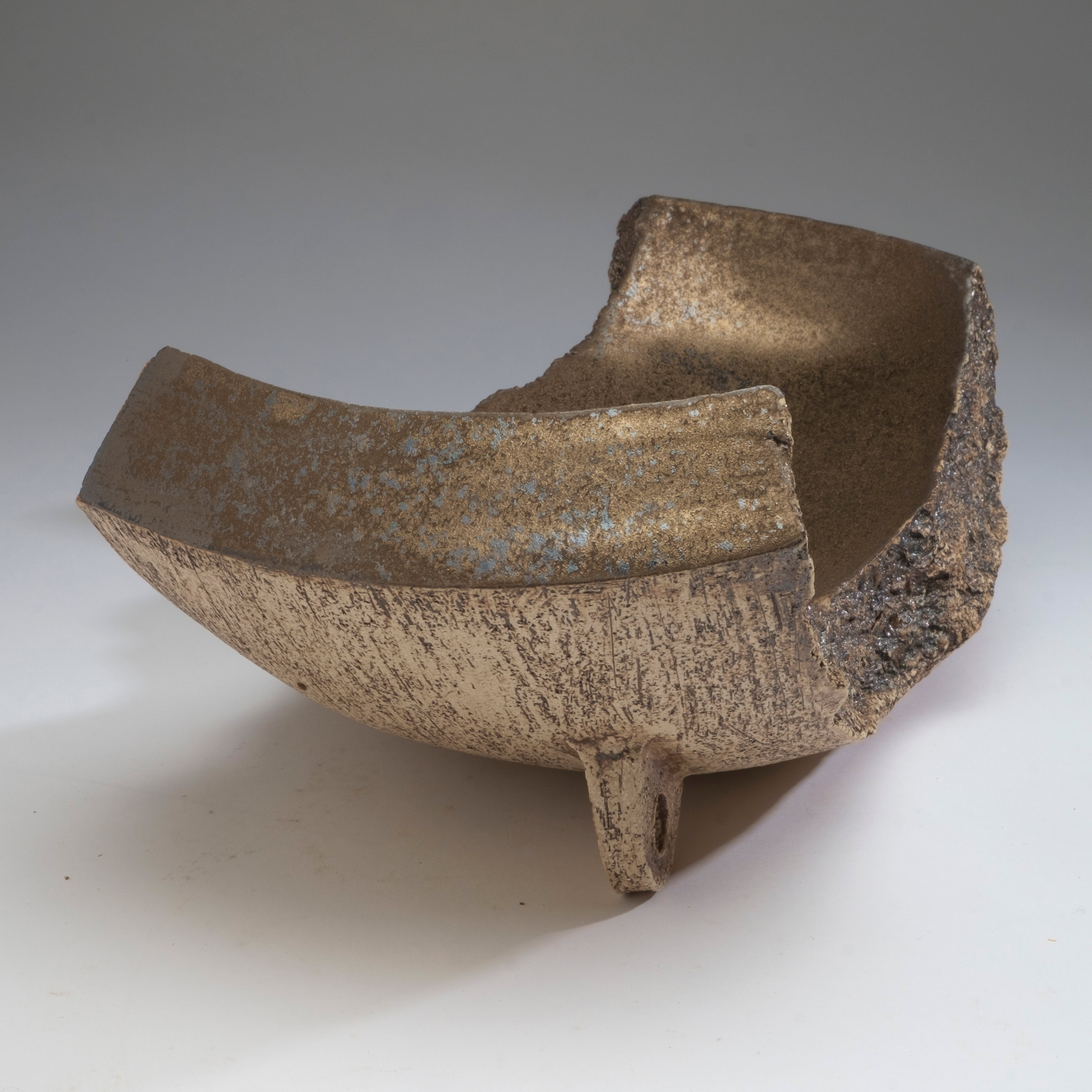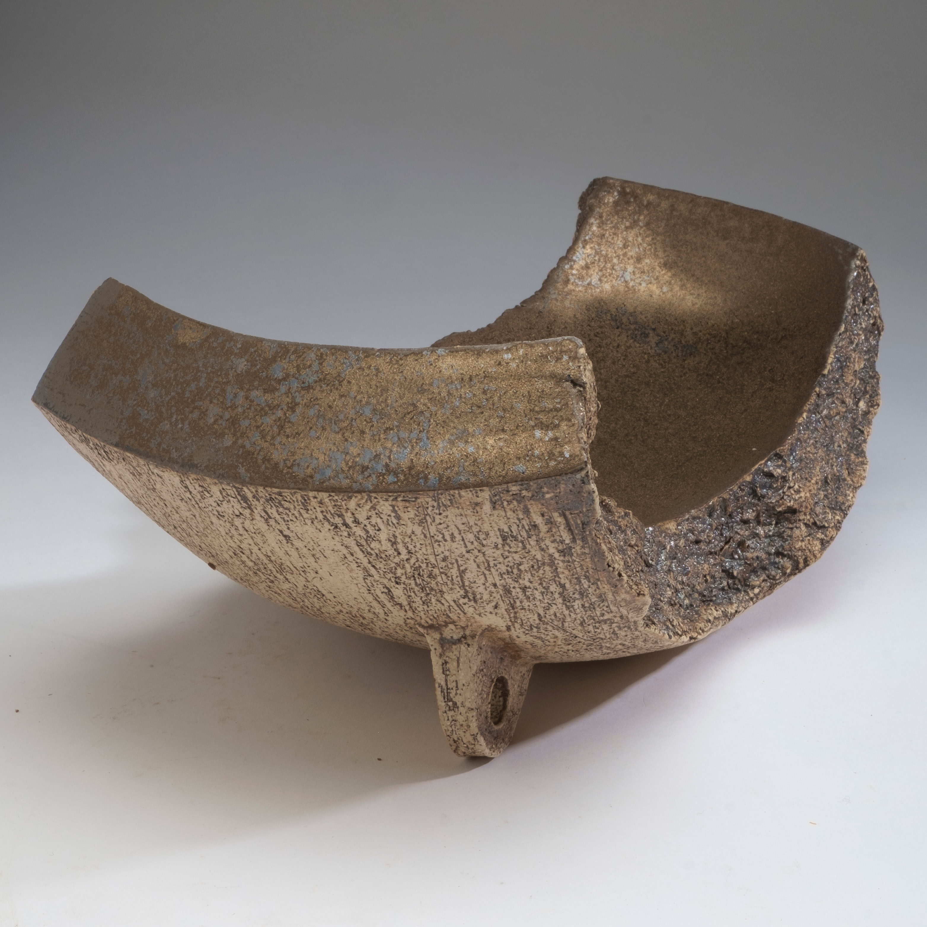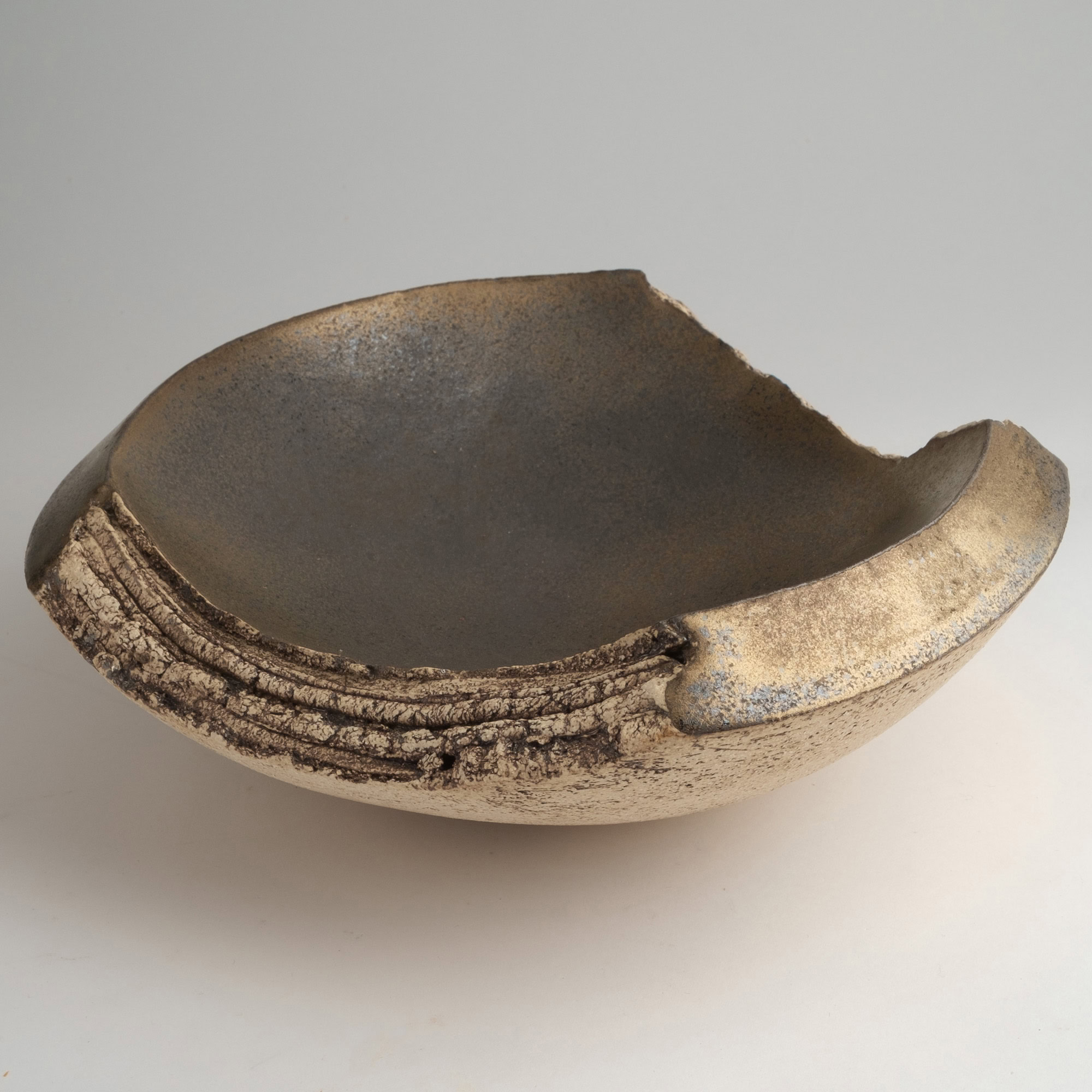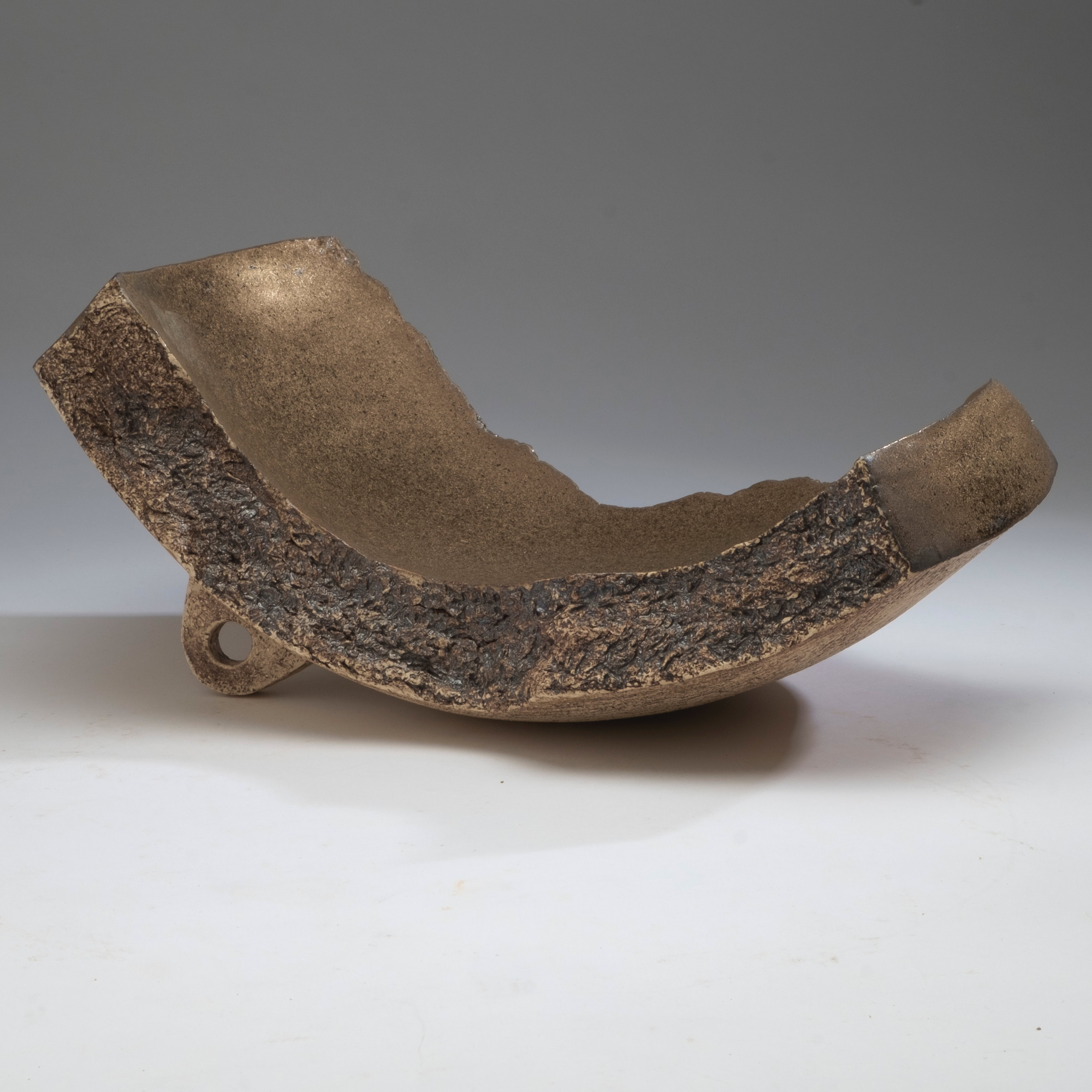 ’Broken’ Bowl. Antique bronze glazed interior, with ‘towing hitch’ below to prop up one end of the form to unbalance it. 25.5 cms wide (at widest point), 11.5 cms high. £105