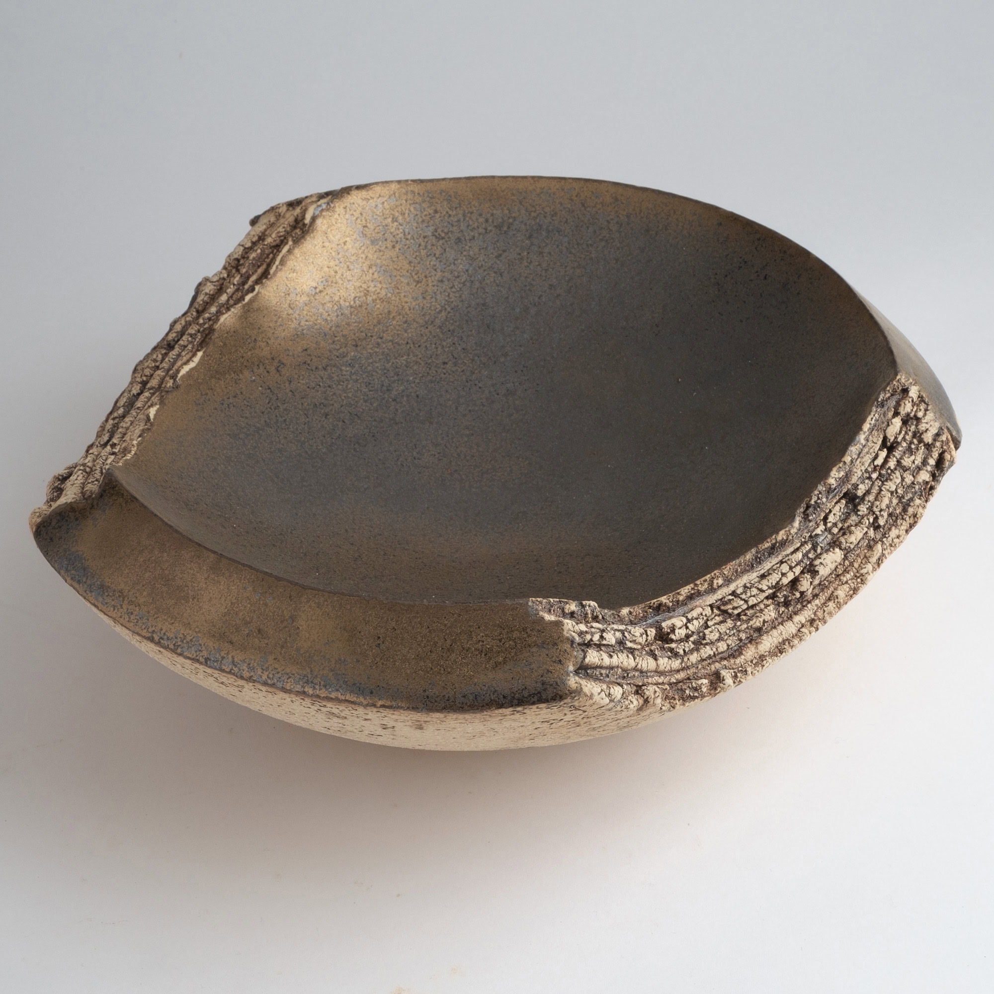’Broken’ Bowl. Antique bronze glazed interior. 21.5 cms wide (at widest point), 6 cms high. £85