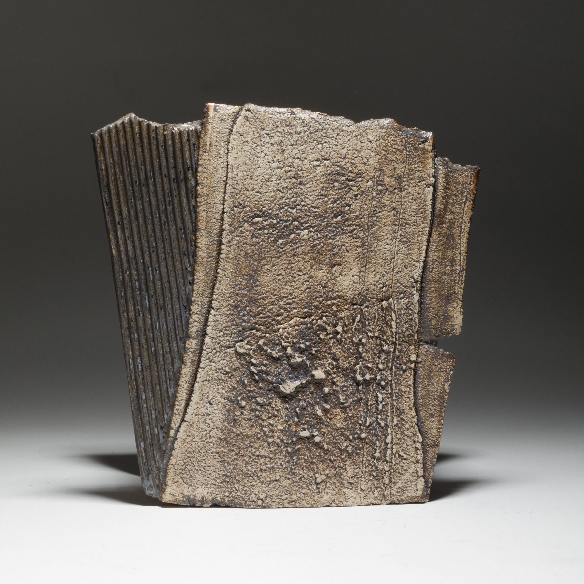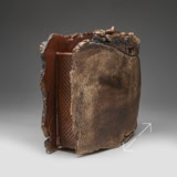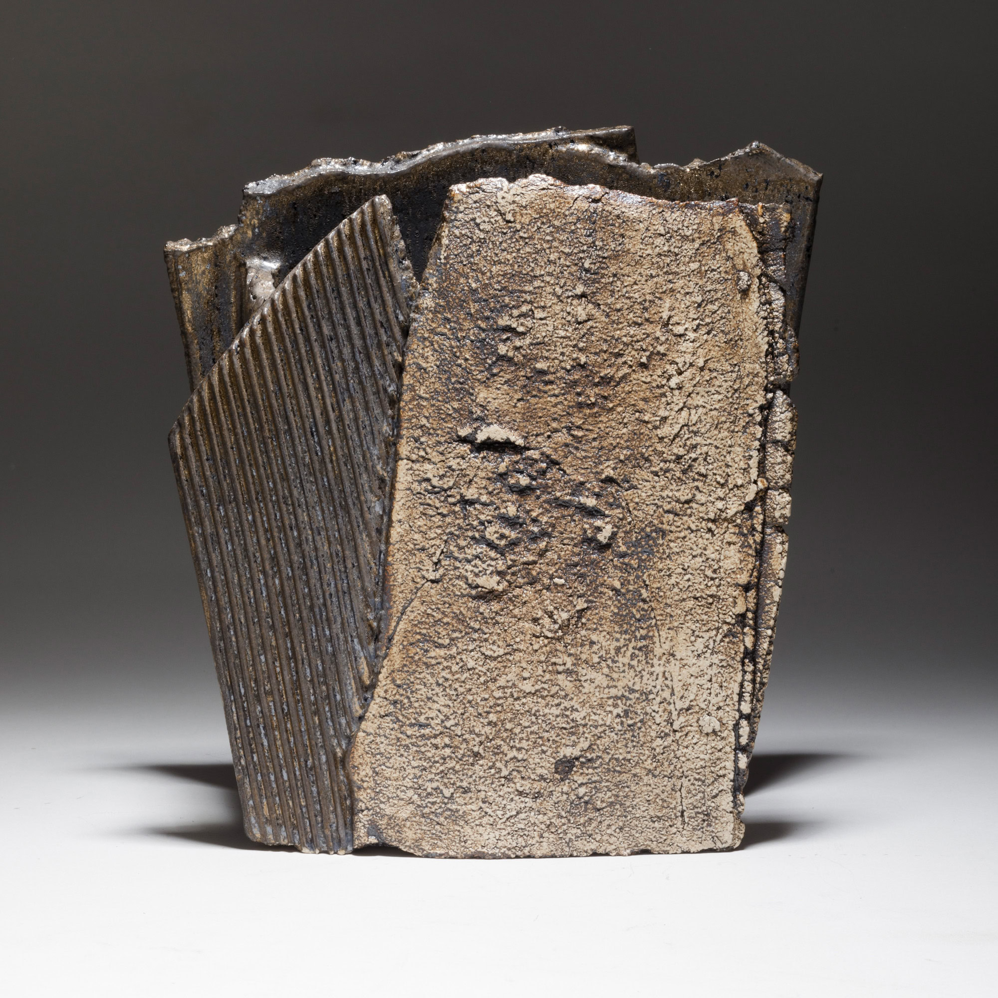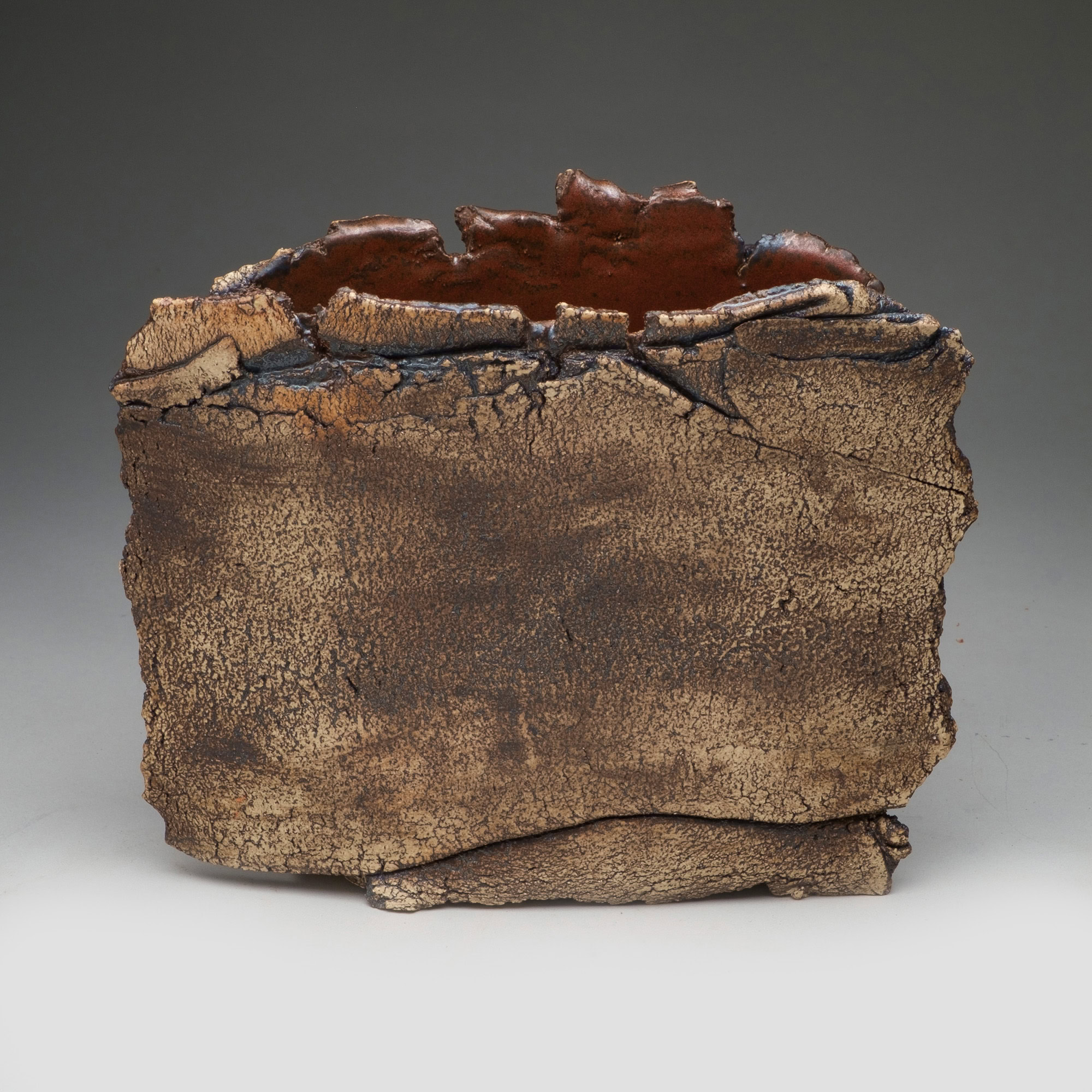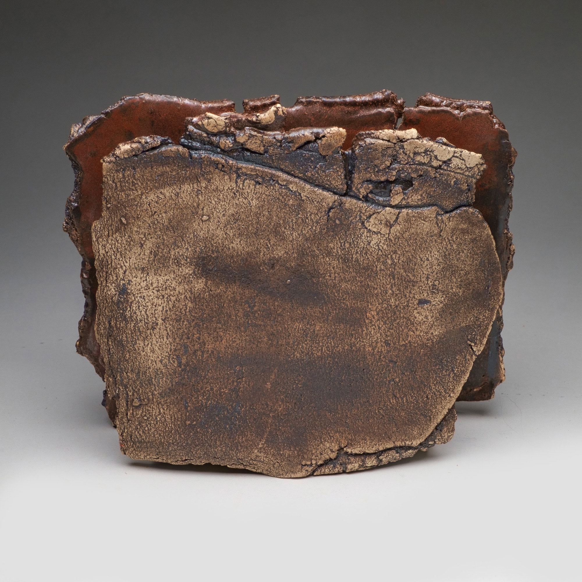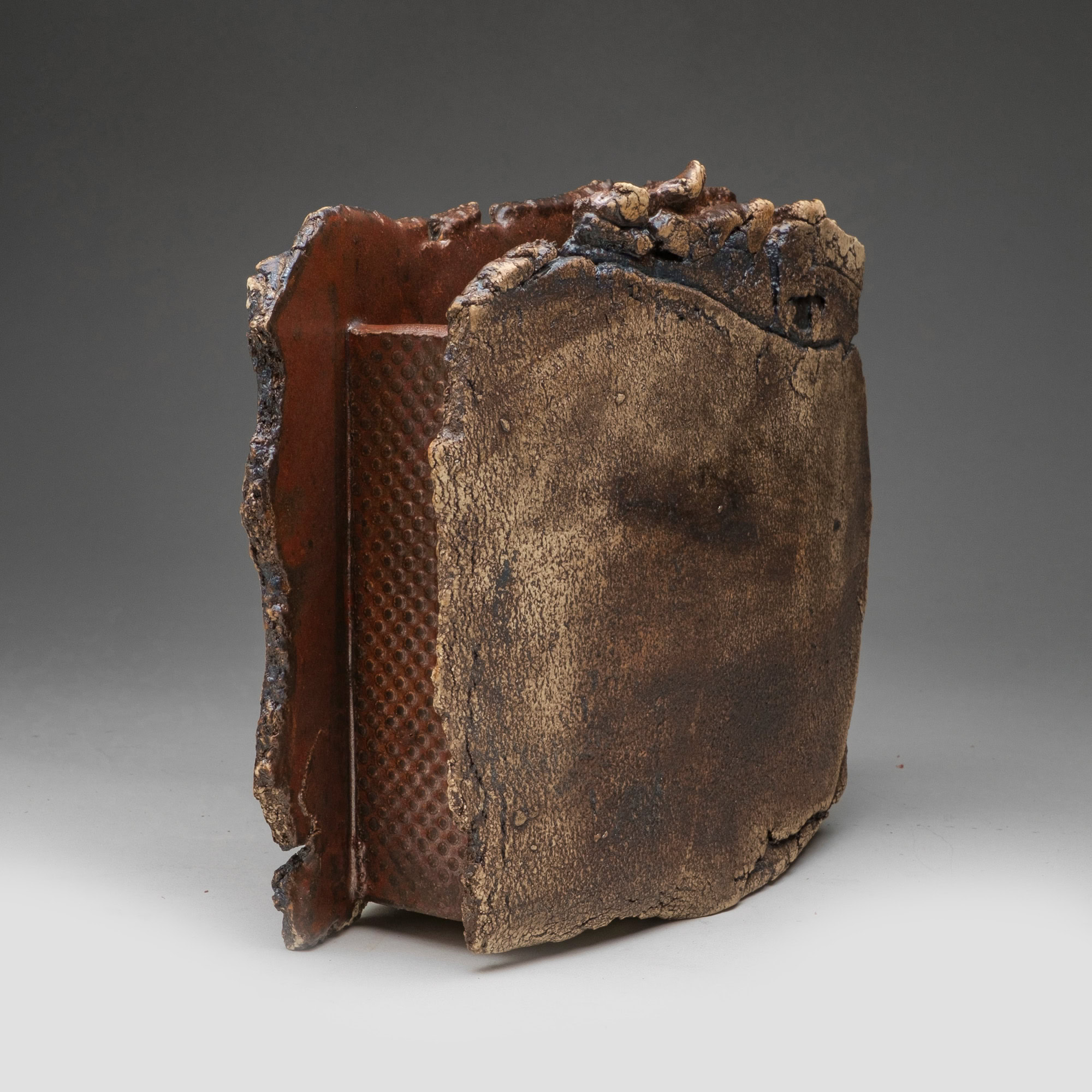 The two faces of this piece, splitting and tearing as they’re rolled out, are joined by slabs pressed into patterned metal. Rubbed oxides with iron-red glaze.