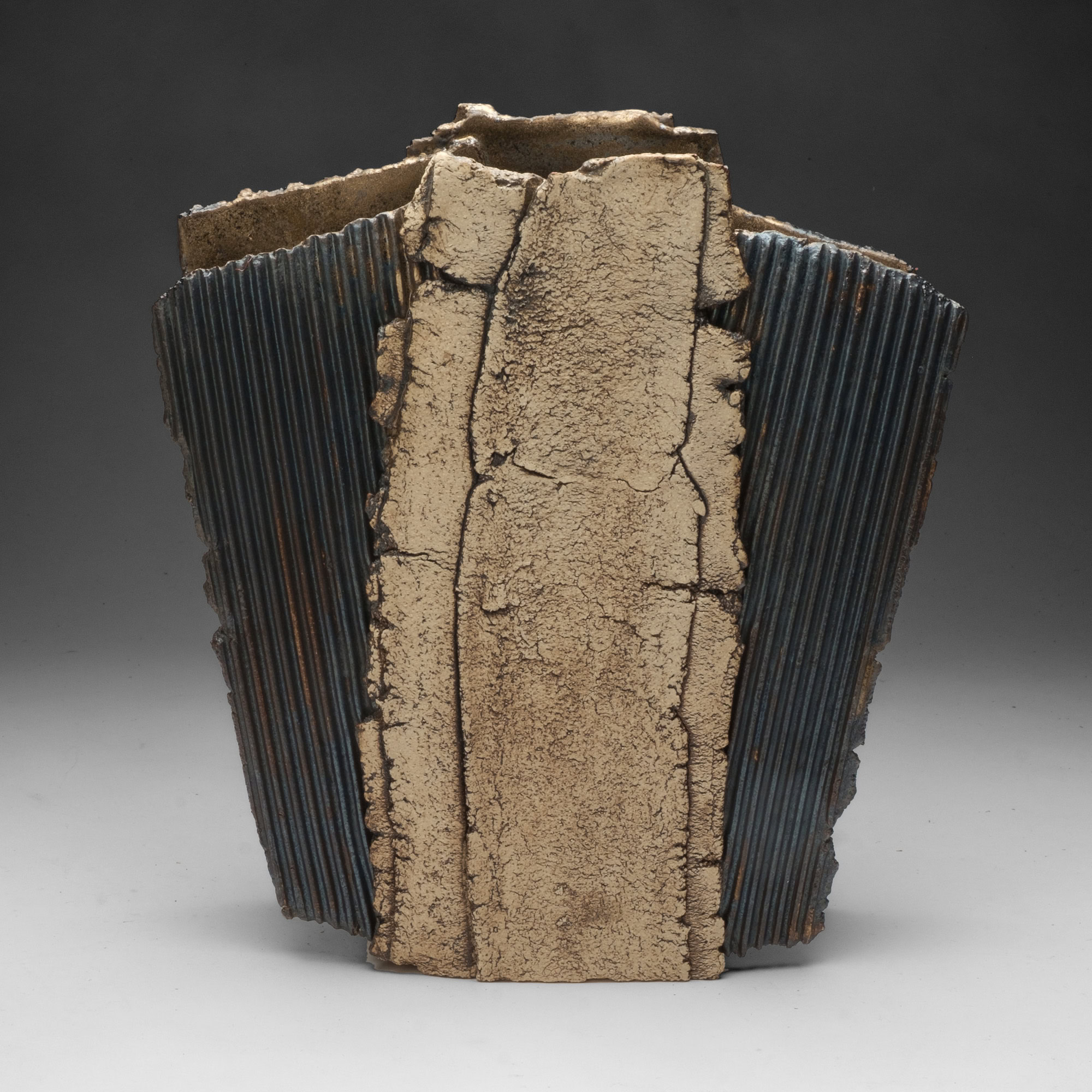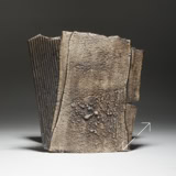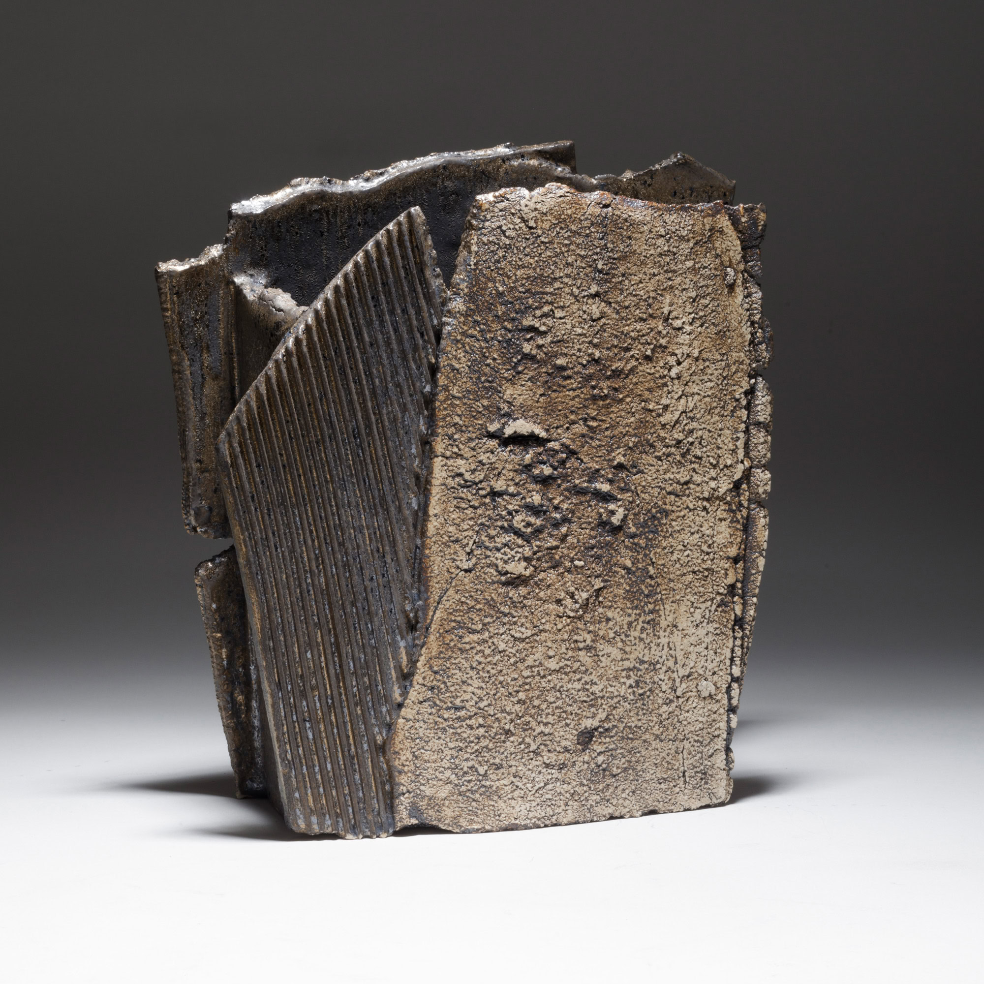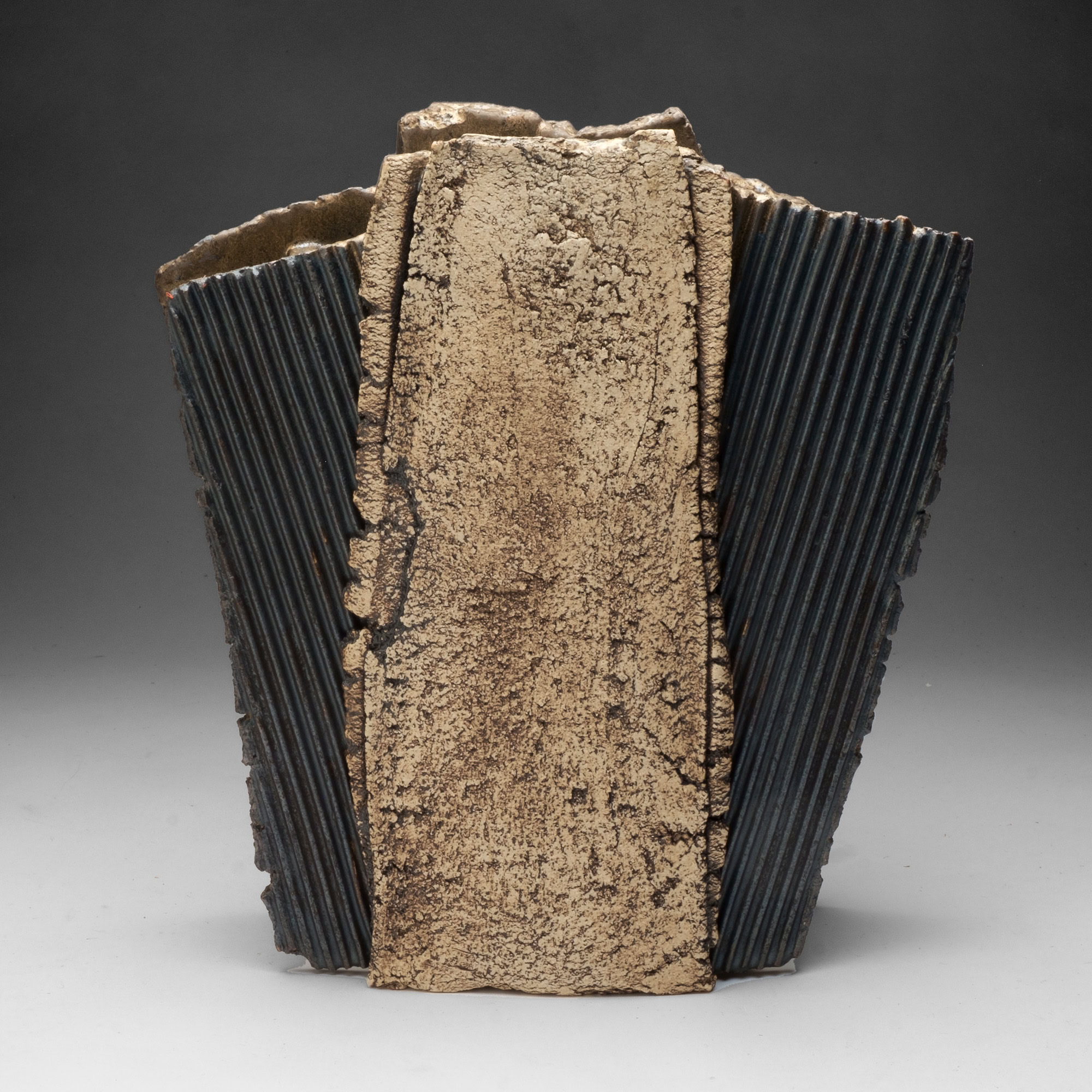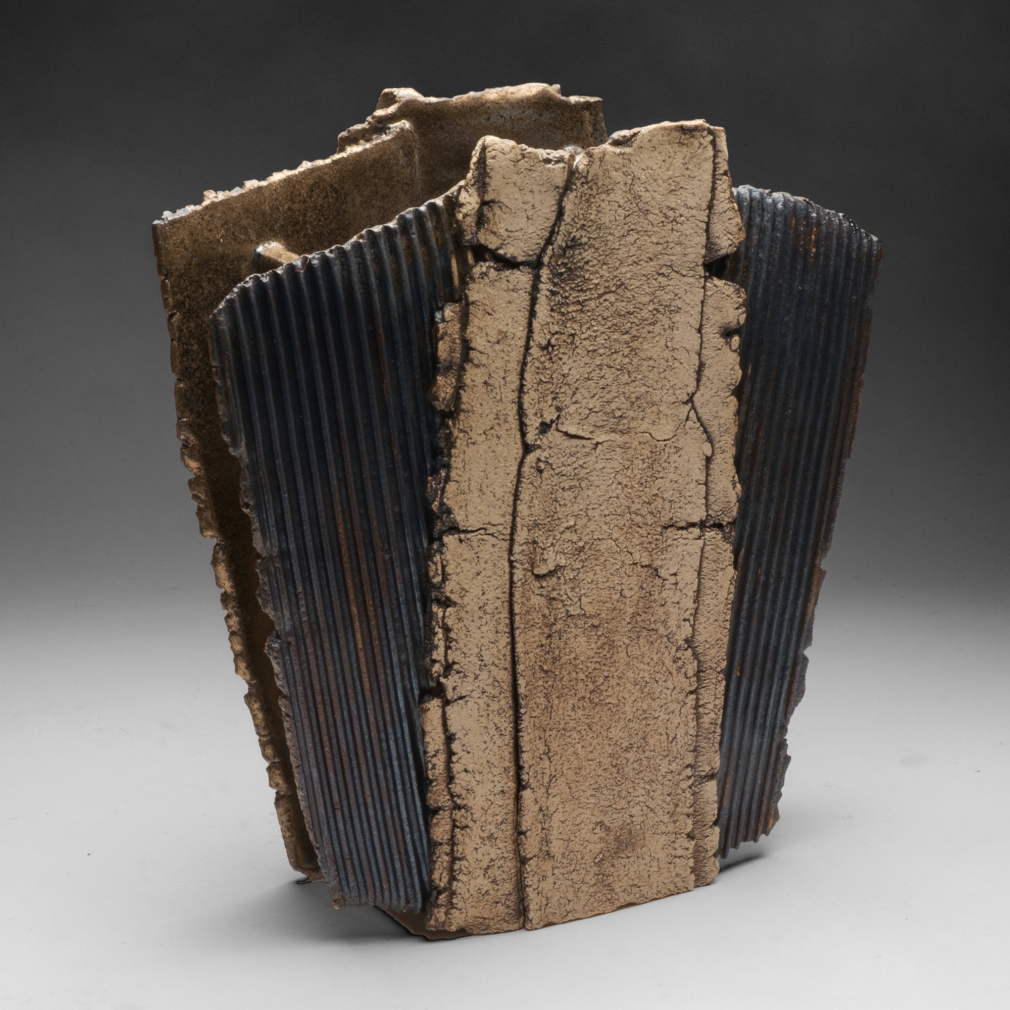 The two faces of this piece, splitting and tearing as they’re rolled out, are joined by slabs pressed into patterned metal. Rubbed oxides with iron-red glaze.