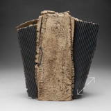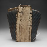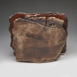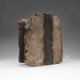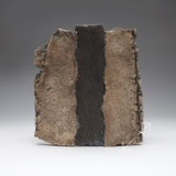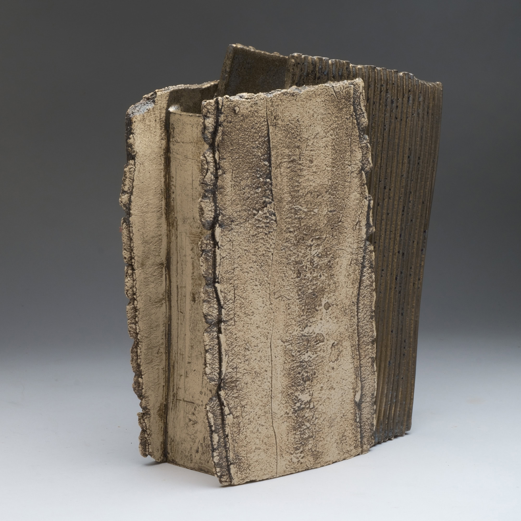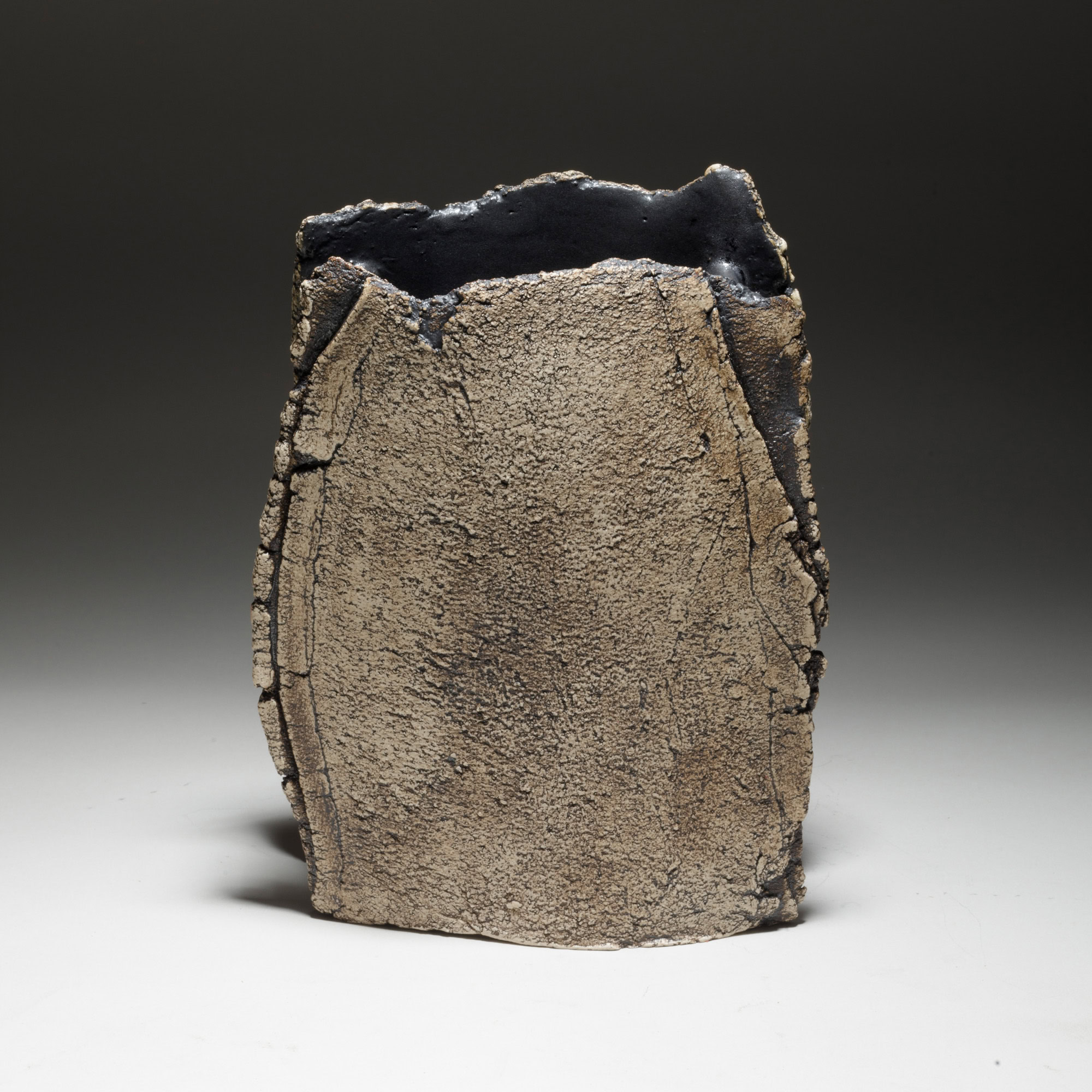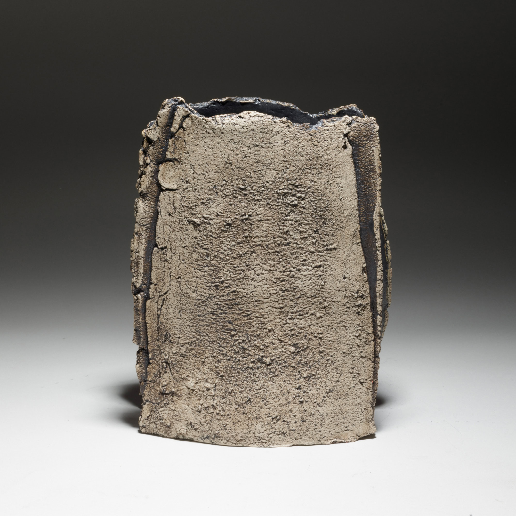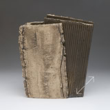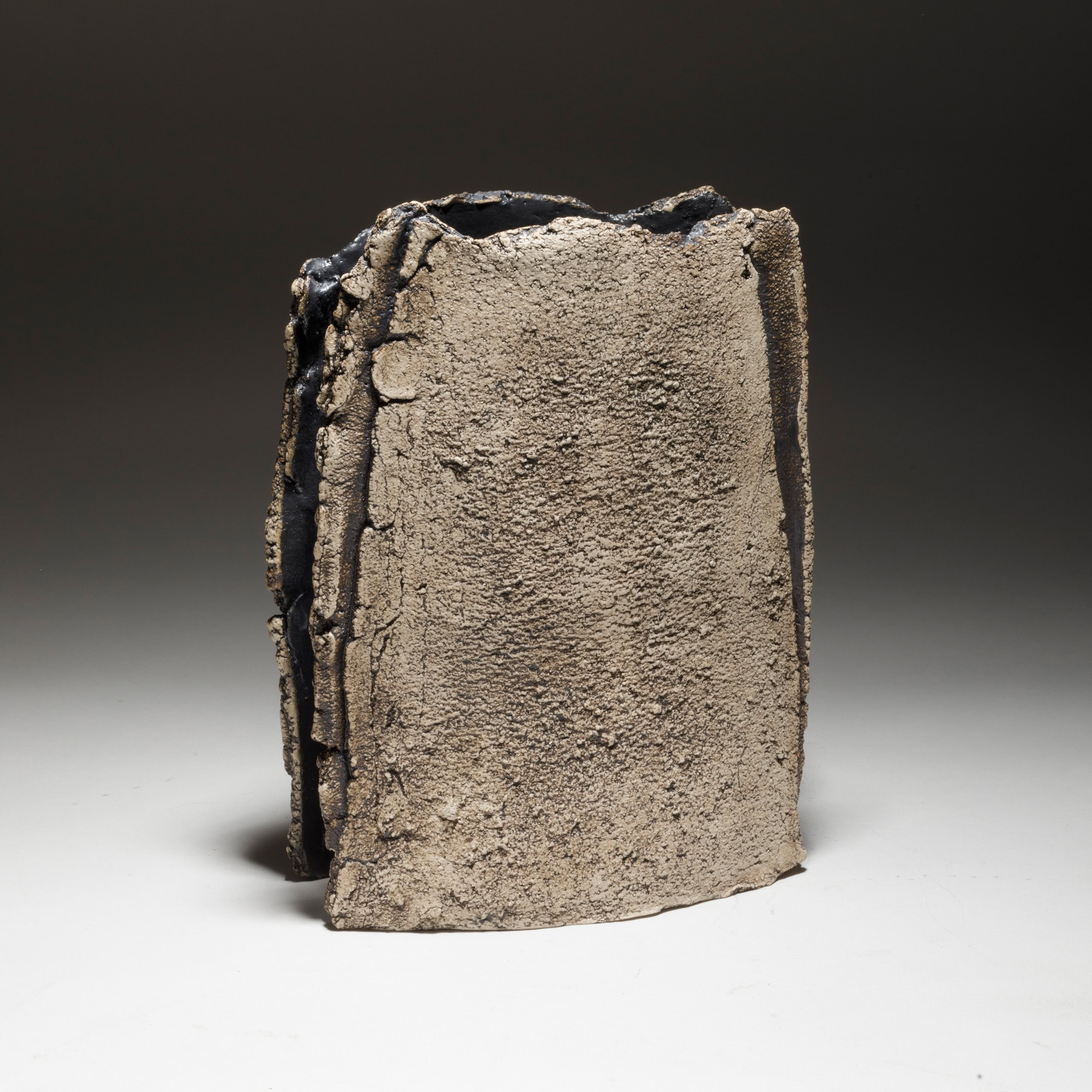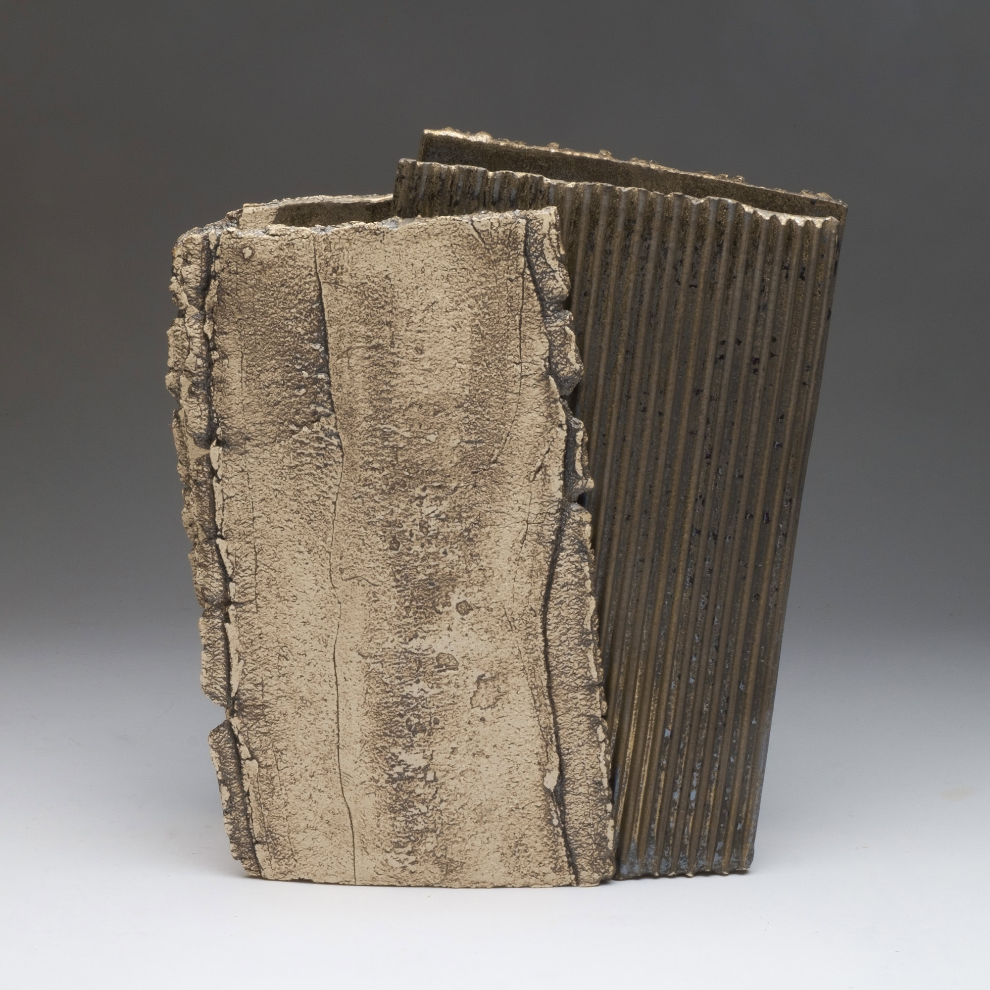 The two faces of this piece, splitting and tearing as they’re rolled out, are joined by slabs pressed into patterned metal. Rubbed oxides with iron-red glaze.