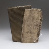 The two faces of this piece, splitting and tearing as they’re rolled out, are joined by slabs pressed into patterned metal.