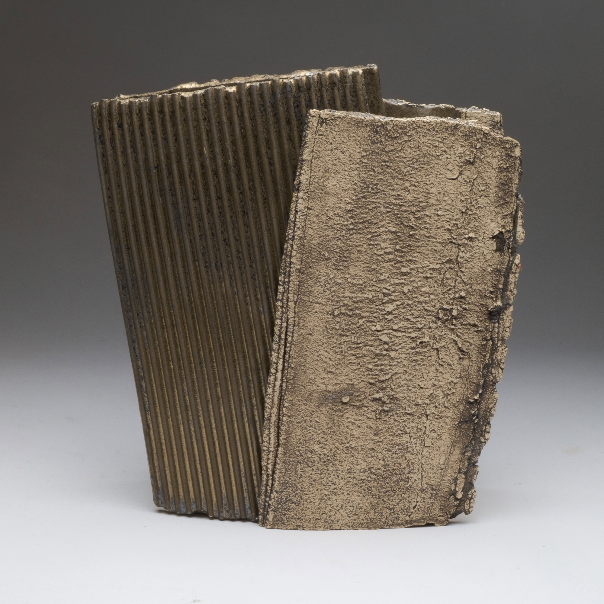 A collision of two worlds: bronze corrugated box meets rough stone-like box